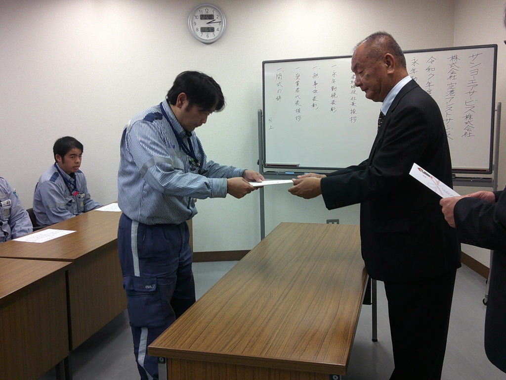 当社サンヨーエアサービス(株)は、関係各社の皆様から日頃からご愛顧賜りおかげさまで創立35周年を迎える事が出来ました。 心から感謝申し上げます。 冒頭、企業35年の歩みを出席者の皆様に伝え、その後、これからの会社運営と方向性を説明し変わりゆく空港の姿や将来に向けた話があった。一方では労働環境の変貌はめまぐベトナム実習生を受け入れから早10年が経過しました。更に、昨年からはスリランカ技能者の受け入れも始まり、日本人だけでの作業環境維持が厳しい状況となってきました。今では、外国籍の協力なくしではこの業界の運営はできません。皆さんと力を併せ会社を成長させ未来に向け発展のさせるために共に頑張って行きましょう。つづいて、永年勤続表彰、無事故表彰受賞者を対象に受賞授与式が行われ、その中には勤続30年と長きにわたり会社の発展に尽力いただいた社員もいて心からお礼申し上げます。 当日はシフトの都合で出席できなかった方もいましたが、改めて状職よりお祝い申し上げます。