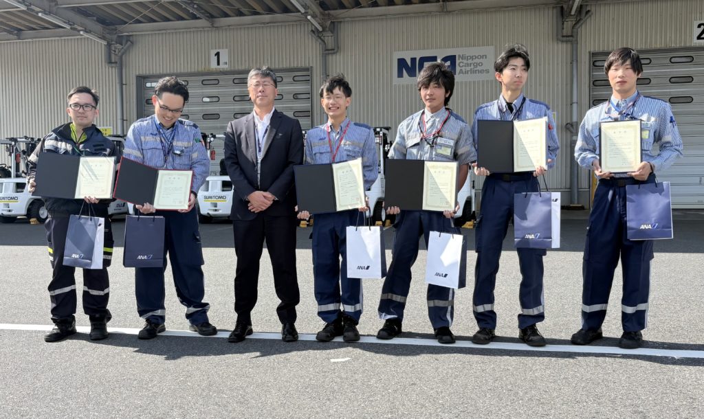 弊社から「N-SEN不安定ULDの固縛方法」について、安全かつ作業時間削減の業務改善が評価され弊社M社員が表彰されました。(写真の右から1番目)